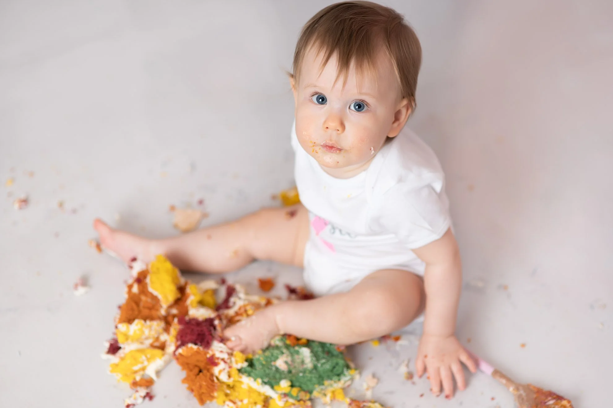Cake smash sessions are ideal for babies around 11–13 months, perfectly capturing first birthday curiosity and expressions.